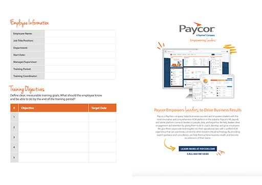 Note: The Paycor employee training plan template is designed to be flexible enough for a variety of industries and roles, making it easy to customize while maintaining a consistent, professional approach to talent development.